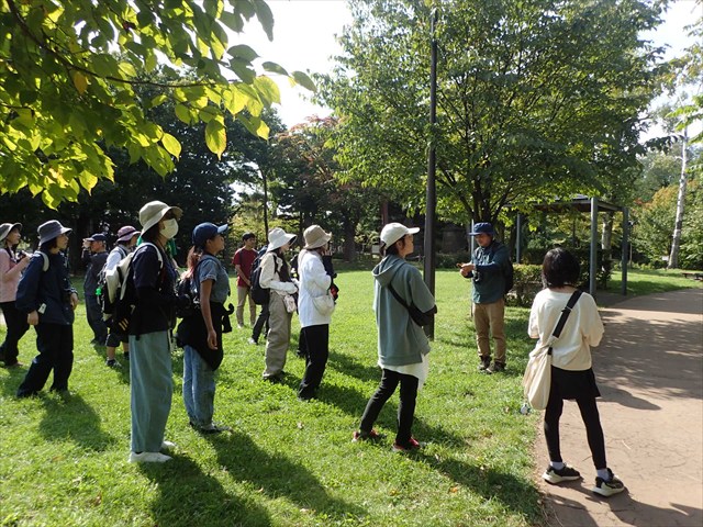 ボート池から、くつろぎの森、歴史の森と巡ると、カエデの並木にイカルの群れが来ていて、カエデの実を一生懸命食べている様子をじっくり観察できました。また、去年はほとんど見られなかったミヤマカケスが、山の木の実不足の影響か今年は10月には見られるようになっていて、この日も私たちの前に姿を現してくれました。カラスの仲間らしい「ジャージャー」という鳴き声や、青や白、黒が混ざった翼も美しく、じっくりと観察することができました。
