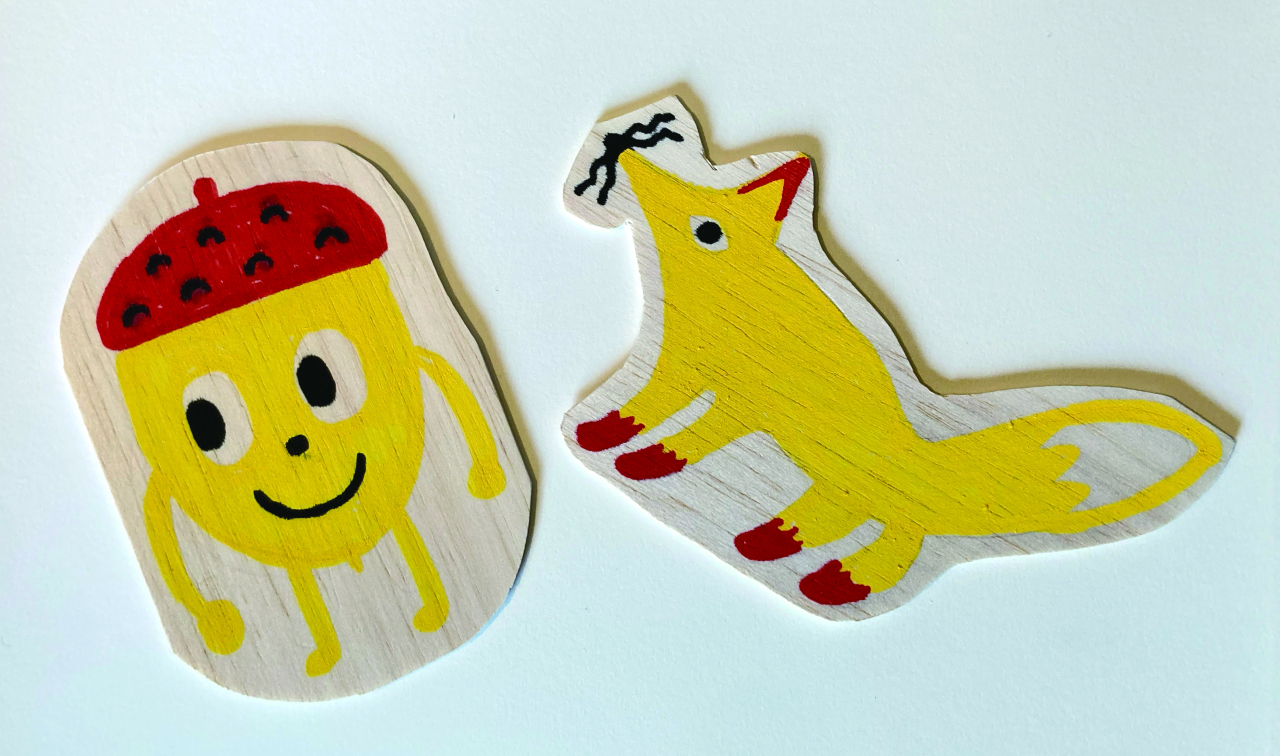 薄い板に、公園の生きものや施設などを描いて、切り抜きます。