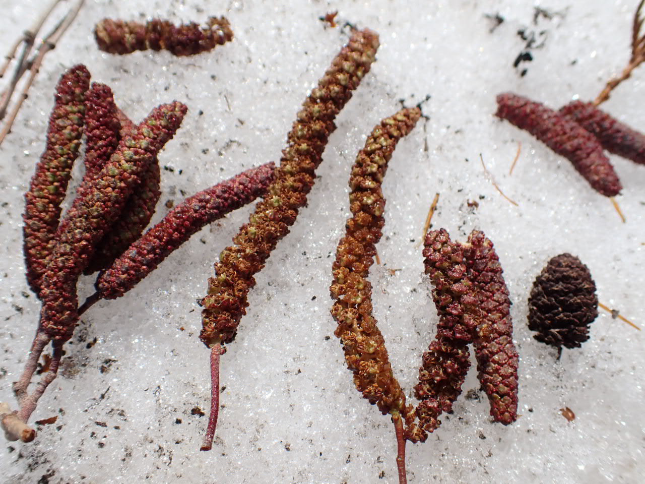 ハンノキも20メートルほどの高さになる高木なので、落ちている花を観察しました。写真の中央の長い2本が開花した雄花で、その両隣の少し短いものが開花前の雄花です。開花した雄花は長く伸びて花粉を飛ばします。ハンノキは、シラカバと同じカバノキ科なので、花粉症の人はちょっと嫌かもしれないですね。ちなみにハンノキは、雄花と雌花が同じ木に付きます。雄花の上に小さい雌花が付いていて、受粉すると実(写真の右端)になります。