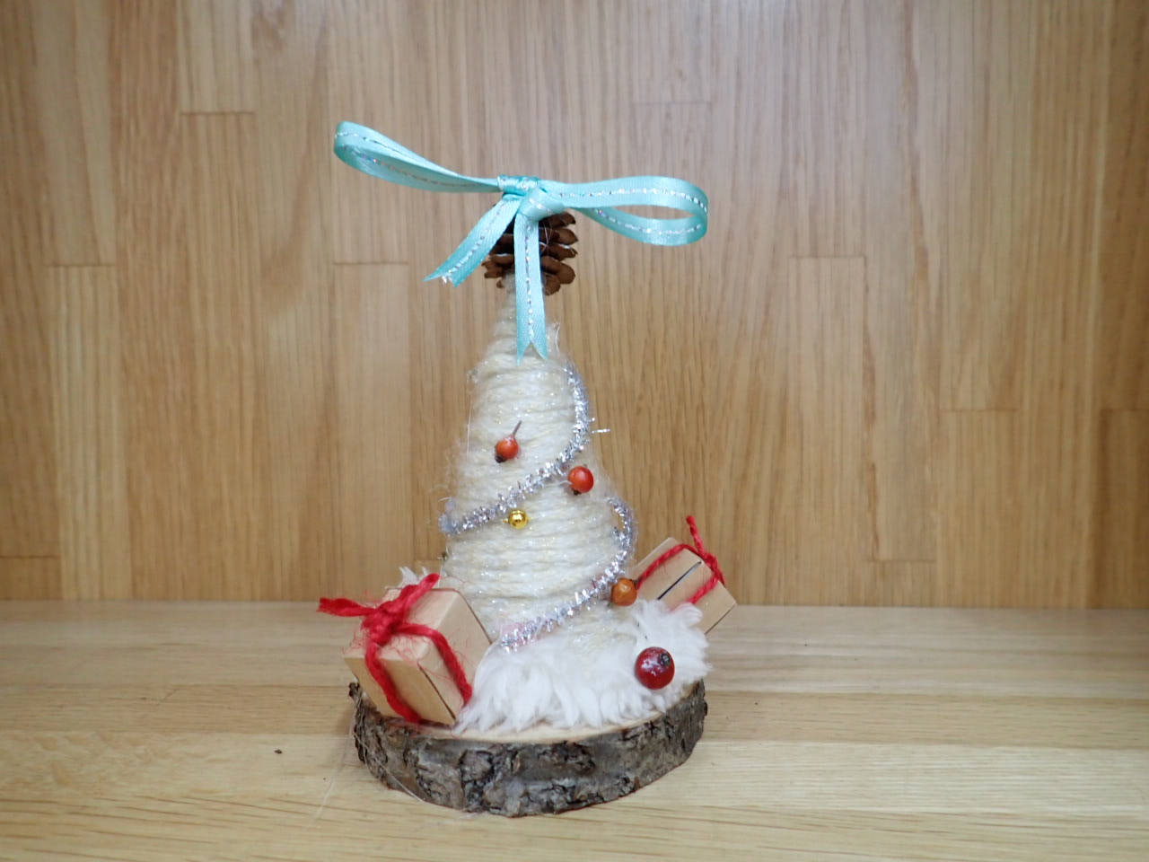 毛糸を巻き付けてつくるツリー、おおきなまつぼっくりひとつでつくる
