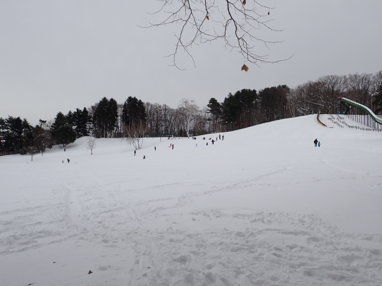 斜面には園路が横切っていて歩いている人もいるので、周囲を確認してから滑るようにしてくださいね。