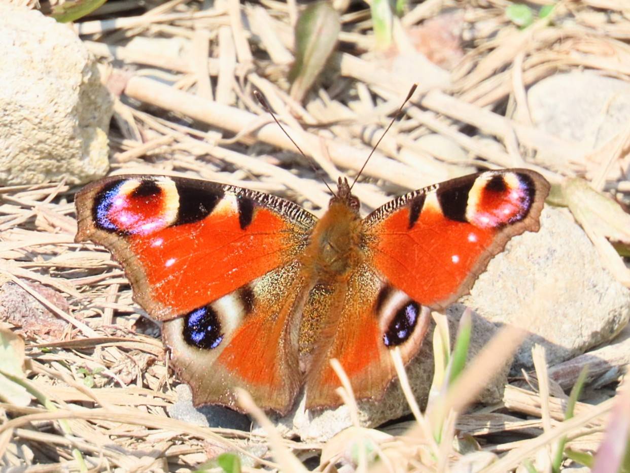 クジャクチョウは成虫で越冬して、春一番に飛び始めます。