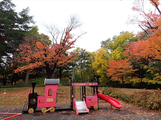 こどもひろばは、エゾヤマザクラが赤く紅葉し、SL遊具の周りを色鮮やかな景色に変えています。