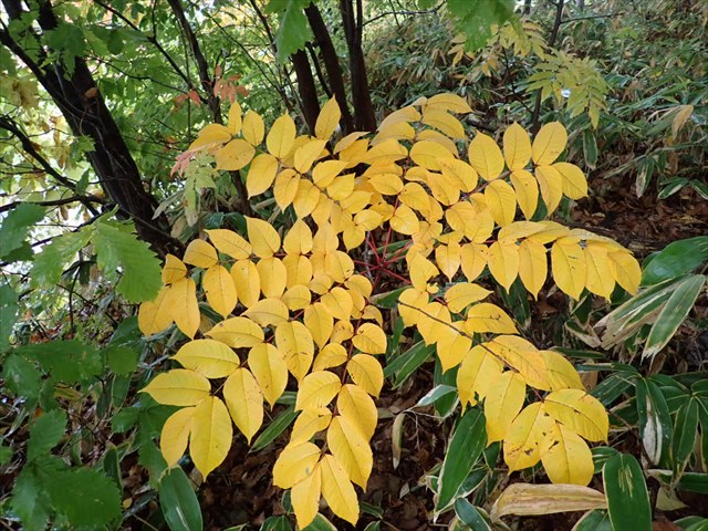 ヤマウルシの葉は、きれいな黄色に紅葉しています。放射線状に伸びる葉が目を引きます。