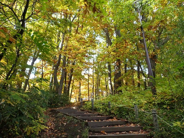 森のあそび場から高台駐車場に上がる階段は、ミズナラの葉が緑から黄色に色づき始め、淡い黄緑色がとてもきれいでした。