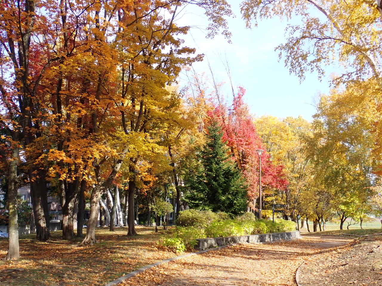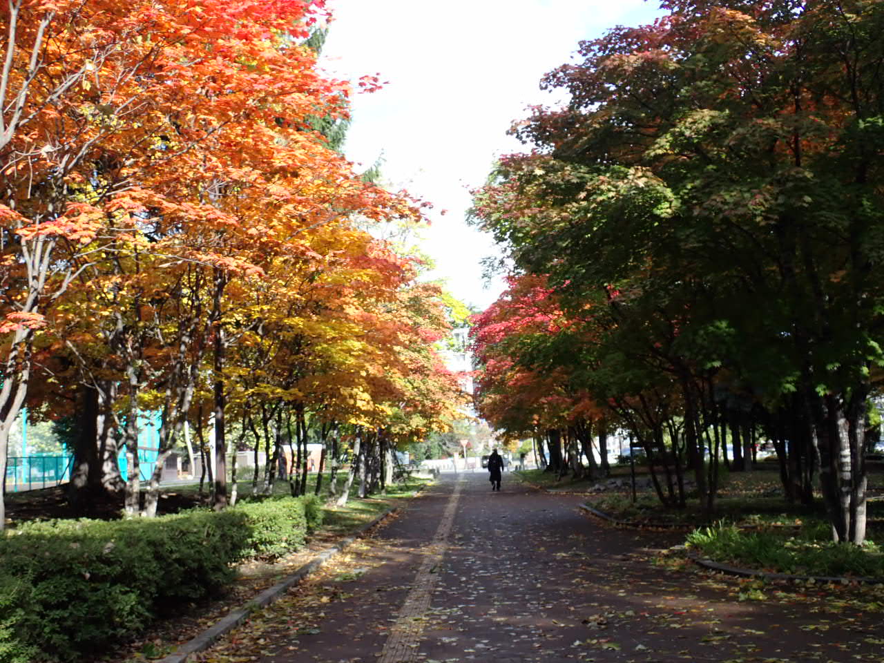 写真は月寒公園の中央園路の様子です。赤、黄、緑ととてもきれいです。