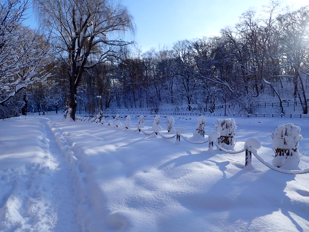ボート池の園路では、チェーン柵の杭に積もった雪が、サンタさんの帽子のようにふんわりと傾いていました。帽子を被った杭が並んだ様子は、なんだか、かわいらしかったです。