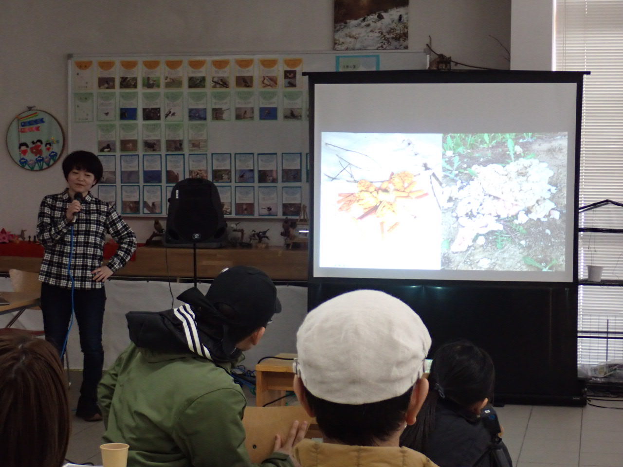 最初に公園スタッフから、写真を見ながら月寒公園の自然や施設などを紹介しました。